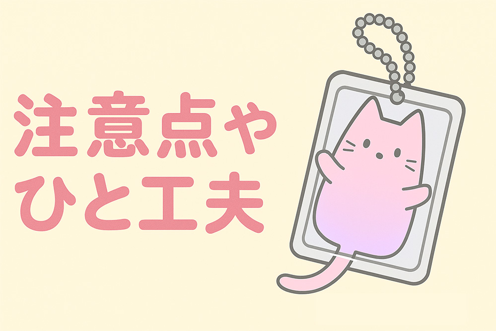 特に特殊な形やサイズのアクキーの場合は、少し余裕があるサイズを選びつつ、内部でしっかり固定されるかどうか確認しましょう。ぴったりフィットするカバーを使うと、デザインが引き立ち、きれいに保てます。