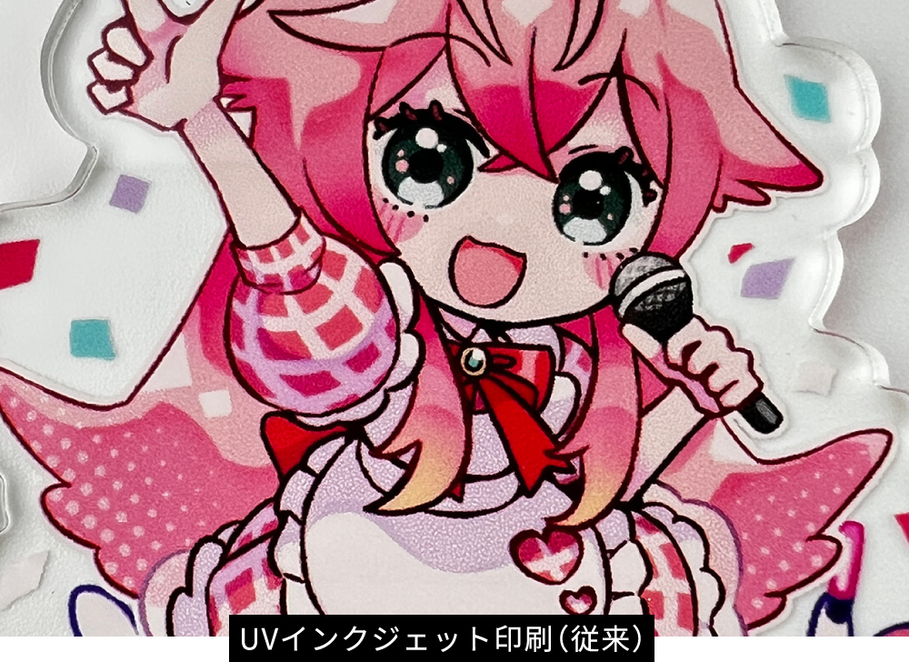 アクリル板に直接インクを吹き付ける方法で、鮮やかな発色が特徴です。