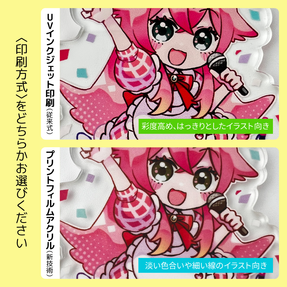 アクリル板に直接インクを吹き付ける方法で、鮮やかな発色が特徴です。